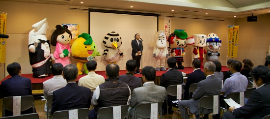 12社の旅行関係者の方が視察に訪れ、広域的な新しい連携エリアを活用した旅行商品の提案を行いました。11日の新しい旅発表会には各市町村のゆるキャラたちが応援に駆け付け、和やかムードの中、商品提案が行われました。